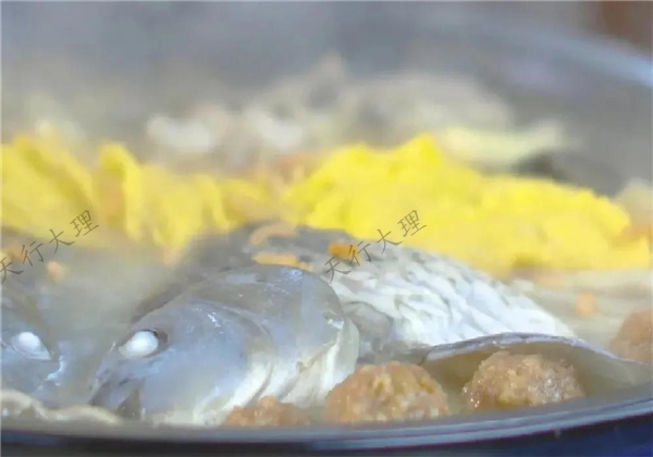 以洱海鯽魚為主材,大理酸辣魚搭配紅椒、青椒、木瓜、楊梅或烏梅為原料,豆腐、土豆為輔料,用土灶燒柴火煮成。嘗上一口,鮮甜甘美,鮮香的魚湯用來泡飯也是一絕。