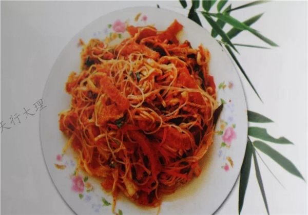 肝生用新鮮的豬肝、豬脾臟、豬皮經(jīng)過煮熟,涼后切成細(xì)絲狀,再放進(jìn)熱油里炸至表皮金黃,將豬小里脊肉用勺子刮成肉末,加入適量食鹽、辣椒粉、食醋扮勻,再與豬肝、豬脾臟、豬皮混合,把它們和發(fā)好的粉絲,以及切成絲的新鮮卷心白、大白菜、胡蘿卜一起加入蔥、姜、芫荽、蒜泥等各種配料,放入適量的食醋、醬油、鹽巴、草果粉、花椒粉、油辣子等調(diào)料充分?jǐn)嚢瑁渖t黃白綠青橙紫,其味酸辣可口,鮮味十足,扎實誘人,讓你忍不住大塊朵頤。